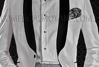 MODELO:1568 OTTAVIO NUCCIO GALAEsmoquin italiano blanco de shantung con solapas a contraste. Modelo solapa chal de raso con 1 botón. Tejido blanco natural shantung mixto seda.Coordinado con pantalón negro tejido mixto lana, fajín y pajarita gris diseño paisley y pañuelo de bolsillo en pura seda gris diseño paisley.