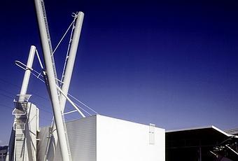 Los elementos del puente mediático, el techo volante y la central eléctrica se unen de forma formal y estática mediante dos largos cables de anclaje en la chimenea.