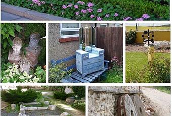 Una de las fuentes más sencillas y que más me gusta es la fuente de pared con caños o máscaras rodeadas con algún tipo de follaje. En la fotografía se muestra una fuente con máscara de león rodeada de una exuberante hiedra. Fantástico, verdad?