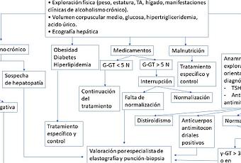 El diagnóstico etiológico de una elevación aislada de la G-GT obliga en todos los casos a realizar una anamnesis detallada en busca de la ingesta de alcohol crónica o consumo de medicamentos, y una exploración física para detectar signos de consumo de alcohol o de una hepatopatía crónica (hígado de consistencia dura, signos de hipertensión portal o de insuficiencia hepatocelular). También se deben investigar el grupo de condiciones constitutivas del síndrome metabólico (diabetes o resistencia a la insulina, índice de masa corporal > 25 kg/m2 , disminución del colesterol HDL, hipertrigliceridemia e hipertensión arterial). Se solicitará hemograma, determinación de lípidos sanguíneos, glucemia, pruebas hepáticas y una ecografía hepática. La búsqueda de marcadores virales y de anticuerpos anti músculo liso sería inútil o muy poco rentable ante una elevación aislada de la G-GT.