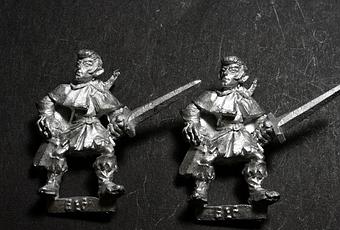 Las figuras de hoy serían de los "primeros nacidos" como Elfos Silvanos. No exitían en catálogos anteriores ni tampoco tengo noticías de que aparecieran en ningún Mail Order Flyers. Estas figuras representan los 8 "espaderos" de los elfos silvanos que aparecen en la página 194 del Red Catalogue de 1991. Todos estos Elfos Silvanos con espada fueron diseñados por Jes Goodwin.