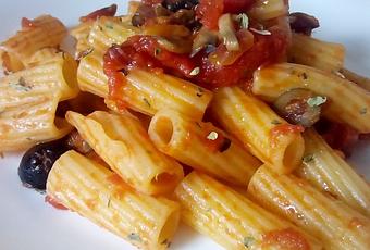 180 gr. de elicoidali, 5 tomates pelados, champiñones, aceitunas negras, cebolla morada, chile/guindilla, vino blanco, 1 diente de ajo, orégano, sal y aceite.