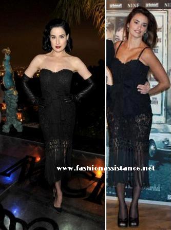 Dita von Teese y Penélope Cruz llevan el mismo vestido de Dolce & Gabanna, Primavera 2010. Dita lo lleva forrado casi hasta la rodilla y lo ha complementado con unos guantes negros de piel por encima del codo. Penélope lo lució antes y eligió una versión más transparente y le añadió unos tirantes finos. ¿Quién te gusta más?