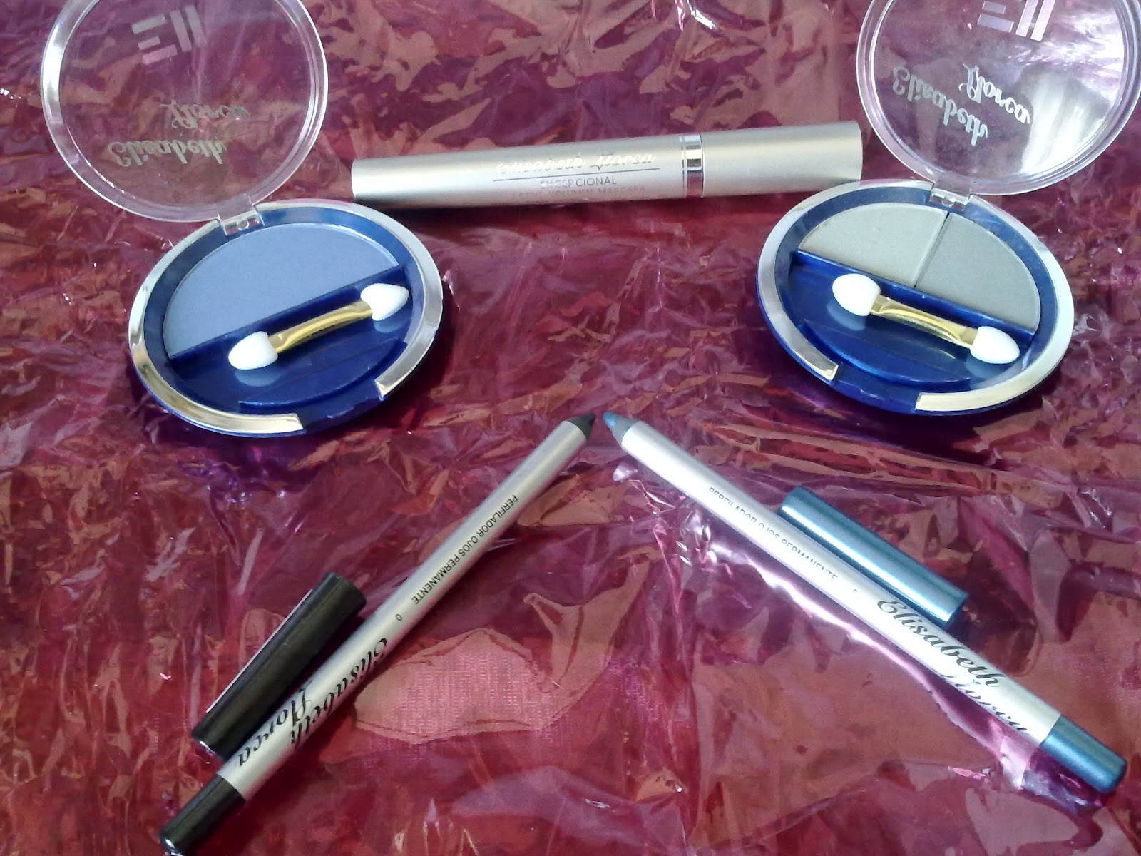 También recibí una gran variedad de productos para los ojos: Una máscara de pestañas en color negro, un dúo de sombras en tonos verdes, una sombra de ojos azul, y dos delineadores, uno azul y otro negro.