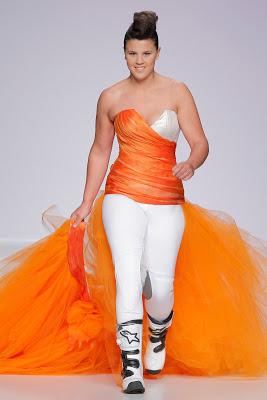 Contra todo pronóstico, desfiló por la pasarela de la mano del diseñador más transgresor de Gaudí Novias, Laia Sanz, la campeona de Dakar. Se enfundó en un vestido naranja, pero sin bajar de sus botas más características.