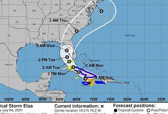 A las nueve de la mañana el centro de la tormenta tropical Elsa fue estimado en los 18.3 grados de latitud Norte y los 76.4 grados de longitud Oeste, posición que lo sitúa a unos 216 kilómetros al sudeste de cabo Cruz, Granma, según el Instituto de Meteorología cubano.En las próximas 12 a 24 horas la tormenta tropical Elsa continuará con similar rumbo, disminuyendo gradualmente su velocidad de traslación. A su paso sobre el estrecho de Colón pudiera ganar algo más en organización e intensidad. En las primeras horas de la tarde de este domingo se desplazará sobre o muy próximo al extremo oeste de Granma y posteriormente por los mares al sur de Las Tunas, Camagüey y las provincias de la región central de Cuba.
