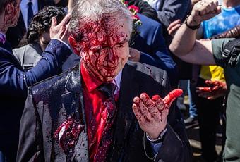 El embajador ruso en Polonia fue atacado con pintura roja por activistas pro-ucranianos en Varsovia el lunes cuando intentaba colocar una ofrenda floral para conmemorar el Día de la Victoria.