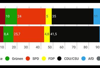 A la izquierda del espectro político alemán tanto el izquierdista Linke como los verdes mejorarían modestamente sus resultados de 2013, aunque de forma insuficiente como para plantear un gobierno alternativo a Merkel. Los liberales, que perdieron por primera vez su representación en el Bundestag tras no alcanzar la barrera del 5% de los votos volverían al parlamento aunque por un margen muy reducido. Los que sí entrarían en el Bundestag serían los euroescépticos de Alternativa para Alemania que ya en 2013 se quedaron a pocas décimas de conseguirlo y ahora catapultados por la crisis de los refugiados lograrían duplicar sus votos. Bajo este escenario sólo habría dos mayorías posibles, la gran coalición entre CDU y SPD o la llamada coalición "Jamaica" entre conservadores, verdes y liberales. Ninguna fuerza política alemana está dispuesta a pactar con la AfD.