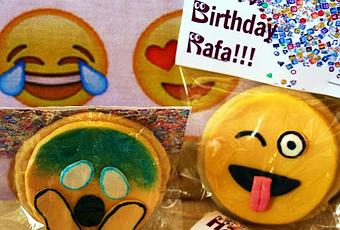 Teníais que ver su cara cuando le dije que para llevar estas galletas al cole me iba a poner una camiseta de emoticonos que me compré hace poco y que aún está por estrenar, el pobre quería pensar que no era cierto que yo fuera capaz de hacer eso. Era broma, por supuesto, aunque yo hubiera sido más que capaz, porque payasa soy un rato, pero con su edad mejor actuar con discreción, no???