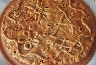 - Con los recortes hacemos unos churos finitos y largos y le hacemos unos adornos y aprovechamos para hacer un agujerito en el centro de la empanada . La llevamos al horno y esperamos a que esté doradita, 25-30 minutos. Una vez cocida, la retiramos del horno y la dejamos enfriar sobre una rejilla.