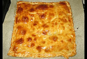 Ahora estiramos la masa y la pinchamos con un tenedor, colocamos el relleno templado encima y tapamos con la otra masa. La cerramos con los dedos, pintamos con huevo batido y le hacemos dos agujeros a modo de chimenea para que salga el calor. Metamos al horno previamente precalentado a 200º durante media hora o hasta que veamos que está dorada. Sacamos y ya está lista para degustar.