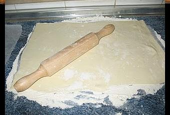 En primer lugar, espolvoreamos harina en el lugar donde vayamos a trabajar el hojaldre y untaremos también de harina el rodillo.