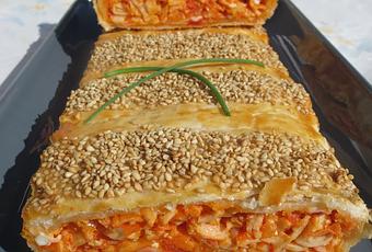 6- Cortar el hojaldre en dos a lo largo, pinchar con un tenedor, forrar la base de un molde, rellenar, tapar, pasar el rodillo para que se corten los extremos (Fotos), sellar bordes apretando un poco con el dedo, pintar con huevo batido y espolvorear semillas de sésamo.