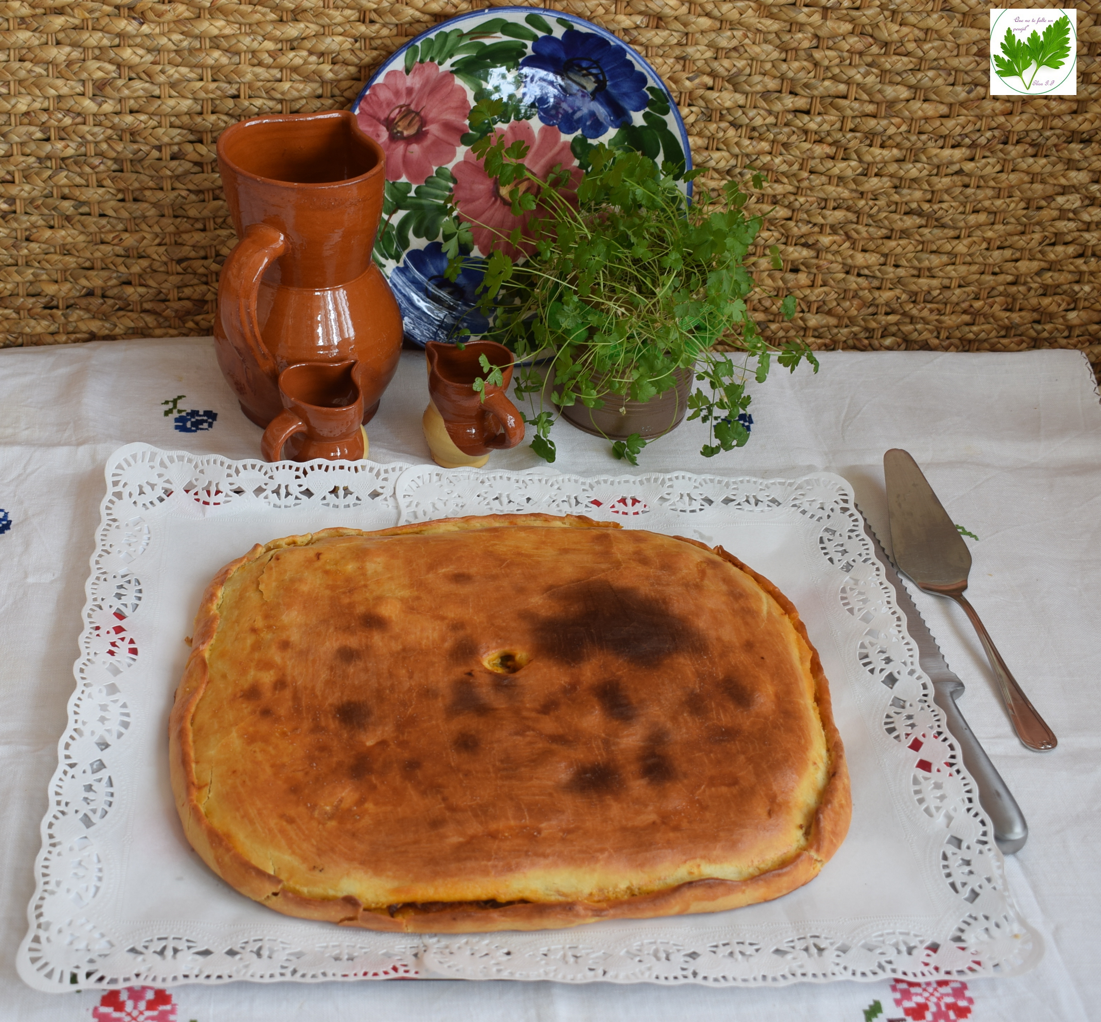 La empanada está recién sacada del horno y mientras se enfría, te invito a tomar un vasito de caldo.