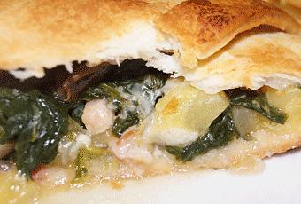 A continuación añadimos el bacón y dejamos unos minutos más. Por ultimo, agregamos las espinacas que ya estarán cocidas y habremos dejado escurrir. Dejamos hacer todo durante 5 minutos. Salamos al gusto.Abrimos y estiramos una lámina de hojaldre, le damos unos toques con un tenedor para que no se infle y ponemos encima el sofrito que hemos echo. Lo repartimos bien por la lámina, dejando espacio en los bordes para luego cerrar.