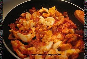 Se ponen las cucharadas de tomate frito en la sartén y se corta el huevo en trocitos para mezclarlo con todo lo demás.