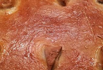 Extendemos la masa en una mesa y hacemos dos partes. Una vez lisa la masa disponemos en una fuente para horno. Ahora ponemos el relleno de carne de pollo y manzana encima de la masa y extendemos por todos los lados. Después tapamos con el otro trozo de masa. Con ayuda de una brocha pintamos la masa con el huevo batido. Introducimos en el horno hasta que se dore la masa.