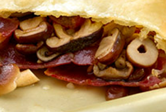 Lo primero que vamos a hacer es poner a calentar aceite en un sartén. En el tiempo que el aceite está listo, aprovechamos para cortar la cebolla, el ajo y los boletus, habiéndolas limpiado antes. Primero, vertemos a la sartén la cebolla y el ajo picado hasta que doren, momento en que añadiremos los boletus. Éstos suelen soltar bastante agua, así que mantendremos la cocción unos minutos hasta que se absorba toda el agua.Mientras se terminan de hacer las setas con el rehogue del ajo y la cebolla, podemos ir partiendo el jamón ibérico en tacos. También podéis probar con otro tipo de relleno como la cecina, que le da un sabor único. Una vez que se ha evaporado el agua de los boletus, freímos los taquitos de jamón. Para retirar los ingredientes, los pasaremos por un colador y apartaremos el aceite.