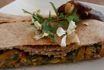 En una sartén saltear el cebollín y el pimentón cortada en juliana, cuando estén blandos, agregar el tomate concassé, la zanahoria y el zapallo italiano rallado grueso,seguir cocinando y agregar las espinacas previamente blanqueadas, el queso crema y el queso rallado, dejar enfriar.En una fuente previamente aceitada acomodar la masa estirada, poner el relleno, cerrar y hornear hasta que esté cocida la masa a fuego moderado.