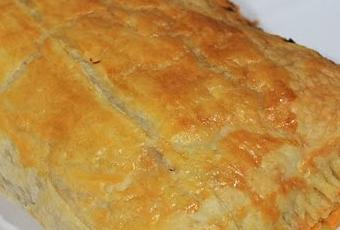 We extend the pastry board and one half we placed slices of ham and cheese alternately. We close with the other half, we pressed the edges, paint and put in the oven for 10-15 minutes at 180 º