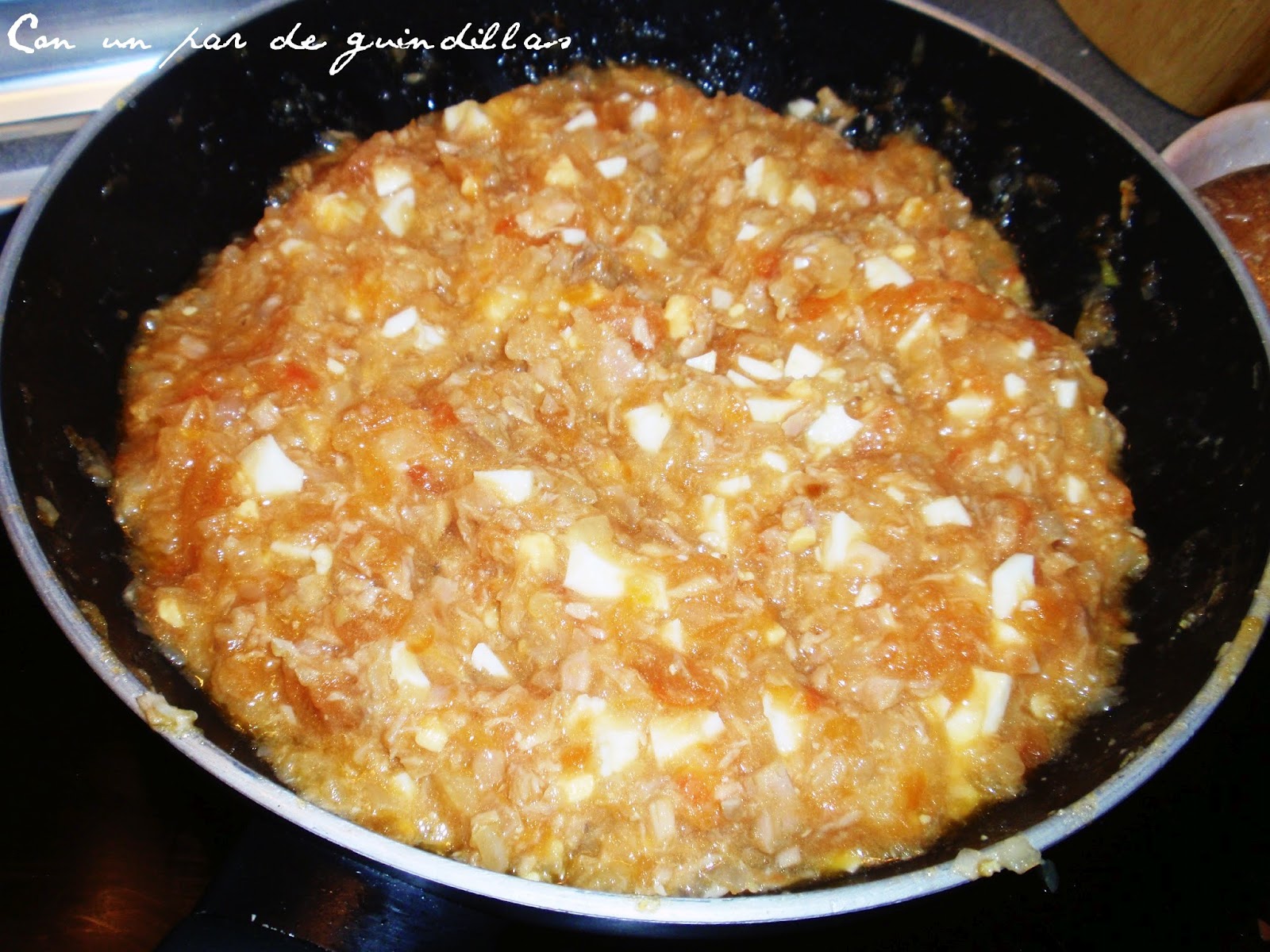 4.- Mientras cocemos los huevos en abundante agua hirviendo. Cuando estén duros los escurrimos, los pelamos y los picamos en dados. Los añadimos al tomate, junto a las dos latas de atún. Desmenuzamos y mezclamos bien.