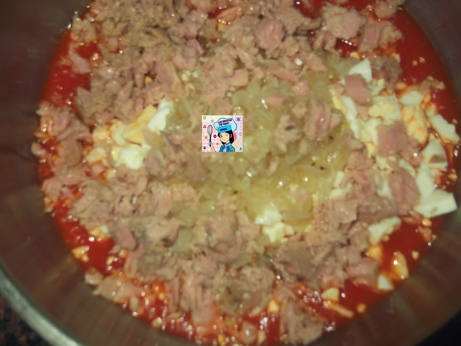 En un bol pondremos el tomate, los huevos, la cebolla y el atún previamente escurrido