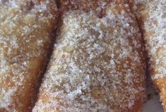 Preparación: En un cazo se calienta la leche, reservando dos un decilitro y medio, con la corteza de limón o el aroma elegido; mientras tanto batir las yemas con el azúcar, la leche reservada y la harina y cuando la leche esté caliente se va añadiendo el batido de yemas poco a poco. Sin dejar de dar vueltas se espera que la crema espese, se retira del fuego y se deja enfriar. Una vez fría, ponemos una cucharada sobre cada oblea, cerrar , apretando bien con un tenedor y freír en una sartén con abundante aceite de girasol. Cuando estén doradas. retirar del aceite, escurrir sobre papel absorbente unos momentos y aún calientes rebozar en azúcar granillo. Se pueden tomar calientes, templadas o frías.