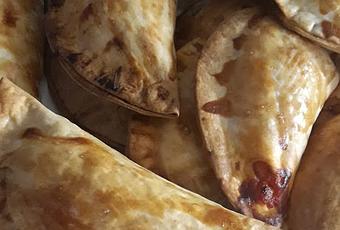 - Humedecemos los bordes de la empanadilla con agua y doblamos hasta juntar los bordes de forma que quede como una media luna.