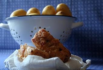 La receta original era con jamón en vez de queso. Yo la he hecho a los tres quesos, para variar un poco y porque el queso me encanta aún más que la patata. Y he puesto además un taquito de queso en medio para que cuando mordamos el emparedado salga todo el queso derretido ;)