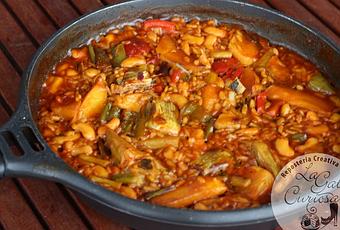 Es un plato que no tiene nada de carne ni de pescado, aunque un poco de bacalao no le iría mal, es bastante parecido al arroz con coliflor y bacalao (para mí el mejor arroz del mundo mundial) normalmente se hace con alubias pero también se puede hacer con garbanzos, dependiendo de los gustos de cada uno.
