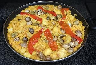 Mientras tanto cortaremos la coliflor y la lavaremos bien y en una sartén con el aceite bien caliente freiremos un poco la coliflor ya una vez un poco doradita la añadiremos a la paella para ir reservando freímos el pimiento en tiras y una vez frito lo reservamos luego la alcachofa a trocitos y reservamos por ultimo añadimos a la sartén los ajos tiernos el tomate rallado y cuando el tomate y los ajos estén fritos añadimos el bacalao lo dejamos unos cinco minutos y retiramos del fuego y añadimos la mezcla a la paella junto con las mochetas ya escurridas añadimos el arroz y los caracoles escurridos y le damos otra agua para sacarles el sabor al laurel y lo que allá quedado los añadimos a la paella y añadimos el caldo que previamente ya tendremos preparado y por ultimo ponemos por encima las alcachofas y el pimiento y lo cocemos durante 20 minutos ya que este arroz se cuece muy bien por su gran absorción.