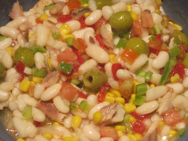 1 bote de 500 gr judías blancas cocidas1 tomate picado1 pimiento verde picado1 cebolleta fresca picada1 lata de 150 gr de maíz150 gr de olivas verdes sin hueso3 pimientos del piquillo asados picado1 lata de caballa en aceitecantidad suficiente de aceite de olivac/s de salc/s de vinagre