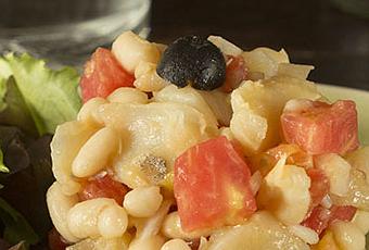 1. Lavamos bien las alubias bajo el chorro de agua fría y las ponemos en una fuente junto con el bacalao, las cebolletas y el tomate cortados en trozos pequeños y las aceitunas negras (en nuestro caso sin hueso y cortadas por la mitad).