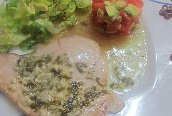 Emplatamos, en el plato que tenemos el aro con la ensalada de tomate, a un lado ponemos la ensalada, de lechuga en juliana, ponemos el filete de emperador, y vertemos sobre el filete, el refrito de ajo y perejil con el limón, decoramos con unas flores de la remolacha que tenemos en la nevera aliñada, quitamos el aro a la ensalada de tomate.