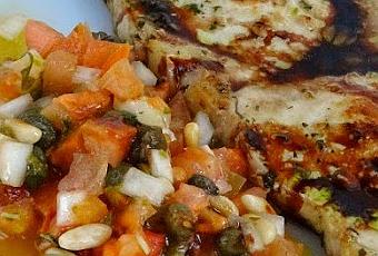 - Hacer los filetes de emperador o pez espada a la plancha con un poco de sal, sin hacerlos en exceso, servir con la salsa y rociar con un chorrito de reducción de vinagre balsámico.