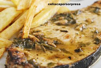 Cuando el emperador empiece a tomar color y esté en su punto, emplatamos, salseando más chimichurri caliente por encima.Acompañamos con ensalada verde o patatas fritas según se prefiera y listo.