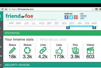 Friend or Foe, en su versión beta, es una web que ha sido desarrollada por la firma rusa Karpersky (así es lo chicos que nos ofrecen uno de los mejores programas antivirus); y a través de este portal puedes realizar un análisis de tu perfil en Facebook y en un instante obtendrás un análisis que te proporcionarán una serie de datos útiles para que seas más selectivo con tu cuenta. De este modo puedes consultar que personas te siguen más, exactamente qué cantidad de datos e información se ha publicado, las aplicaciones que has permitido que se integren en tu perfil y hasta consultar el historial de todas búsquedas que has llevado a cabo.