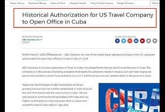 ABC Charters, Inc., uno de los operadores de viajes más antiguos a Cuba en los EE. UU. abrirá sus oficinas en Cuba.ABC tiene cerca de 40 años de experiencia en Viajes a Cuba , incluidos el Servicio de Charters y Servicios Terrestres en Cuba, informó PRNewswire.