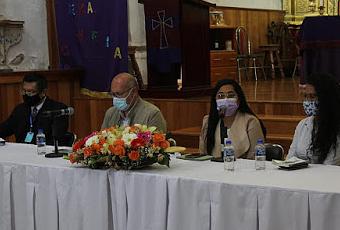 La Presidenta Municipal de Texcoco Sandra Luz Falcón Venegas, el Director del centro INAH Estado de México Antonio Huitrón Santoyo, La directora de Cultura de Texcoco Rosana Espinoza Olivares y el Párroco José Bonifacio Márquez Pat, reunidos en la iglesia d3e San Luis Huexotla, estuvieron presentes en la conferencia de prensa.