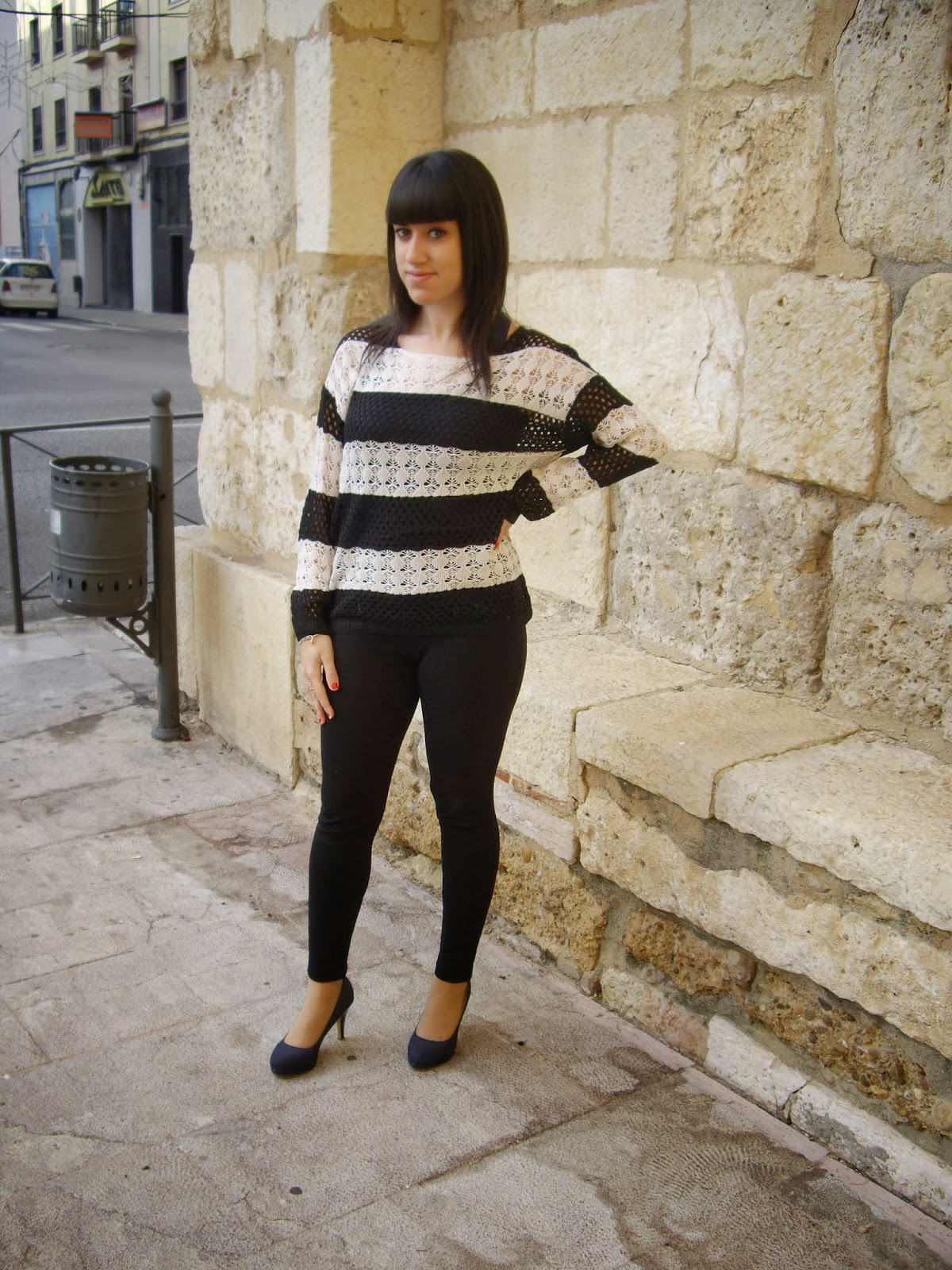 En esta ocasión, elegí un jersey calado, en colores azul marino y blanco, tuve ciertos problemas para que me llegara ya que una vez en España, la oficina de correos parece ser que me lo extravió, pero ahora ya lo tengo conmigo y tengo que decir que me encanta, es un jersey muy versátil, verdaderamente es de verano, pero ahora se le puede dar juego con una camiseta debajo.