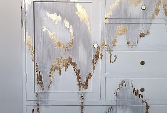 Era un mueblecito simpático, pero necesitaba reparaciones! Sacarle molduras, arreglar cajones que mostraban una luz en la parte superior, enderezar la puerta, y agregarle la pieza triangular a una de las patas. Todo eso vino primero, y despues el desafío de una pintura diferente.Consultas: [email protected]