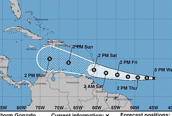 A las 5:00 de la tarde de este miércoles, la tormenta tropical Gonzalo, seguía su curso oeste noroeste en aguas del Atlantico, en ruta al Caribe.