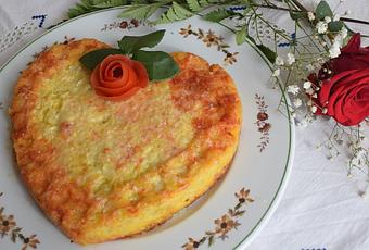 Como no podría ser de otra forma, si hay celebración hay tortilla. Hace poco, hice ésta para San Valentín, gustó mucho y prometí volver a hacerla; así, he pensado que ahora es un buen momento para repetir y darles el caprichito. Es una tortilla de patatas, con cebolla y Parmesano a la que añadí un resto de mermelada de tomate que quedaba en la nevera. La idea ha sido estupenda y el resultado excelente. Las patatas y la cebolla están cocinadas en microondas pues es más ligera, se hace sin ensuciar y más rápido. Para variar, la horneé y gratiné con el queso en el horno convencional.