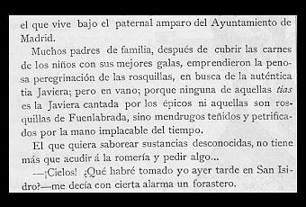 Hoy os traigo un recorte del 18 de Mayo de 1884 del Diario Madrid Cómico. Nos dice la penosa peregrinación de las rosquillas, en busca de la auténtica 'tia Javiera' (muchos rosquilleros decían ser descendientes de este personaje para intentar vender más pero esta persona no aparece en ningún registro). Un intento en vano ya que ninguna de aquellas 'tías' es la Javiera ni son rosquillas de Fuenlabrada, sino mendrugos teñidos y petrificados.