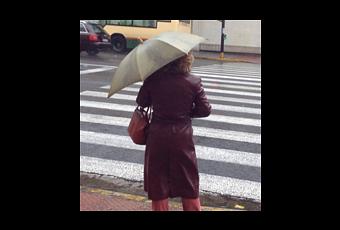 Paraguas sujetó a dos manos, es la más practicada. Con una mano se coge con fuerza la empuñadura, con la otra mano se mantiene lo más próximo a la cabeza, eso si siempre orientado en contra del viento. Te sigues mojando, pero así el paraguas no sale volando.