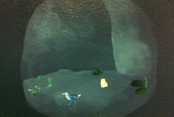 Sobre un fondo de mancha azul aparecen pequeñas figuras que cuentan historias que parecen sacadas de un cuento.
