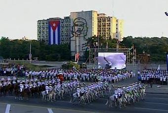 Reseña quiénes integran el desfile: niños y jóvenes, 90 estudiantes de la Universidad de Ciencias Pedagógicas Enrique José Varona, internacionalistas, integrantes de los Ejércitos del país, las Brigadas de Producción y Defensa, las Milicias Universitaria, los niños que forman parte de la compañía teatral infantil «La Colmenita» y, en general, el pueblo de Cuba.