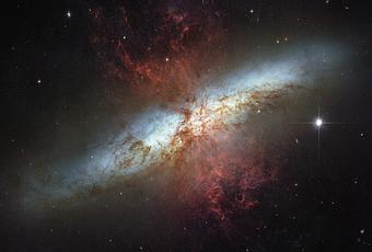 La Galaxia del Cigarro, también llamada M82, es una galaxia irregular situada en la constelación de la Osa Mayor a una distancia de unos 12 millones de años luz. En el centro de la galaxia las estrellas nacen diez veces más rápido que lo que lo hacen en nuestra Vía Láctea las cuales se acumulan, en la brillante y blanca parte central, en cúmulos estelares de gran densidad. Siguiendo a este ritmo de creación de estrellas dentro de unas pocas decenas de millones de años se agotará el material disponible.