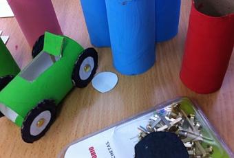 Se trata de un coche hecho con material reciclado, rollo de papel y cartón. También necesitamos encuadernadores y pinturas.