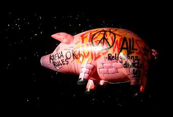 Debido a la negligencia por parte del manager de no contratar a alguien para cuidar el inflable de cerdo durante el tour, éste se perdió en los cielos y fue recuperado en una granja en Kent. La fabrica presente en esta portada es la Battersea y Algie, también el nombre del cerdo volador. Animals representa una de las portadas más importantes de la banda y fue una muestra del poder de decisión de Roger Waters, pues los creadores de la portada querían mostrar a un niño sorprendiendo a sus padres teniendo sexo: “Copulando como animales” fueron las palabras de Thorgerson.